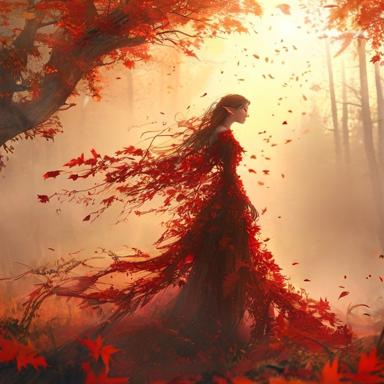 Test Prompt: VibrantlySharp style, 3pic_vist4, animeniji, in a soft-focus painterly concept art style Upper body profile view, autumn dryad elf adorned in translucent red foliage and bark-textured silk, wind animating her hair and dress into motion, background: ancient twilight forest, distant amber sunlight diffused through fog and drifting leaves.