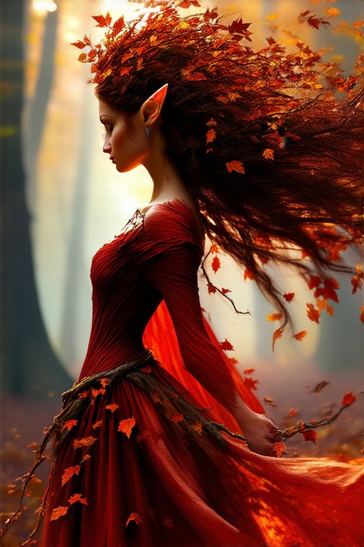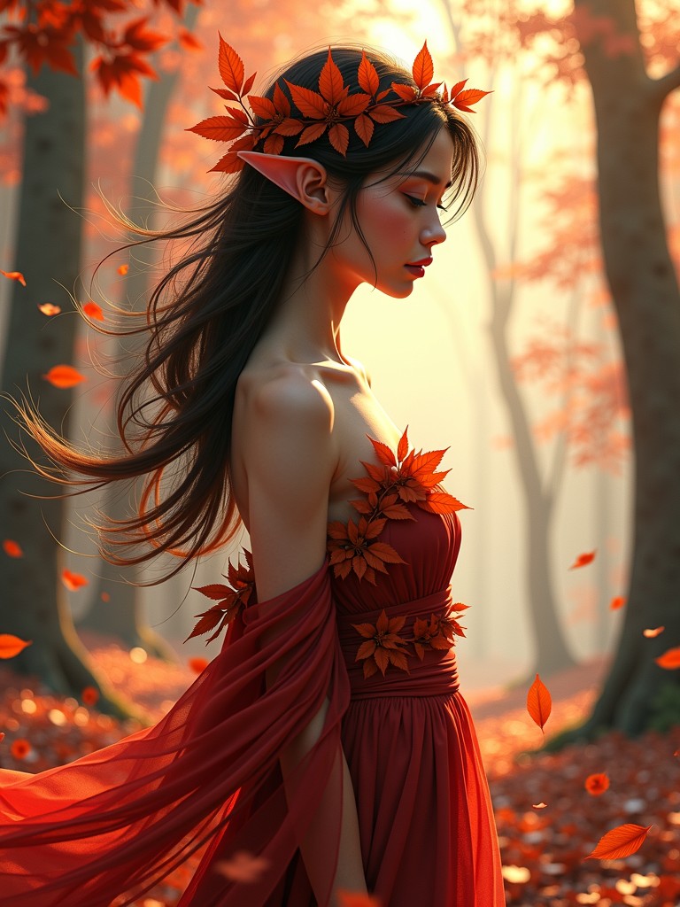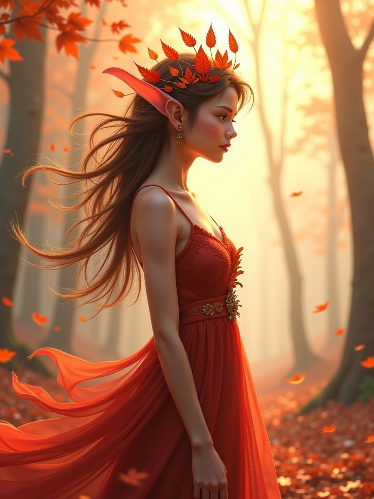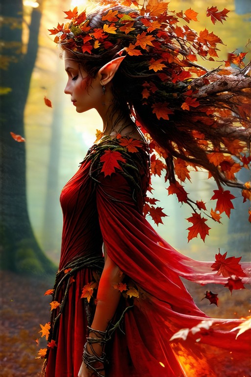 Test Prompt: VibrantlySharp style, 3pic_vist4, animeniji, in a soft-focus painterly concept art style Upper body profile view, autumn dryad elf adorned in translucent red foliage and bark-textured silk, wind animating her hair and dress into motion, background: ancient twilight forest, distant amber sunlight diffused through fog and drifting leaves.